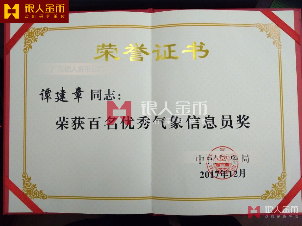 全國百名優(yōu)秀氣象信息員獎(jiǎng)榮譽(yù)證書