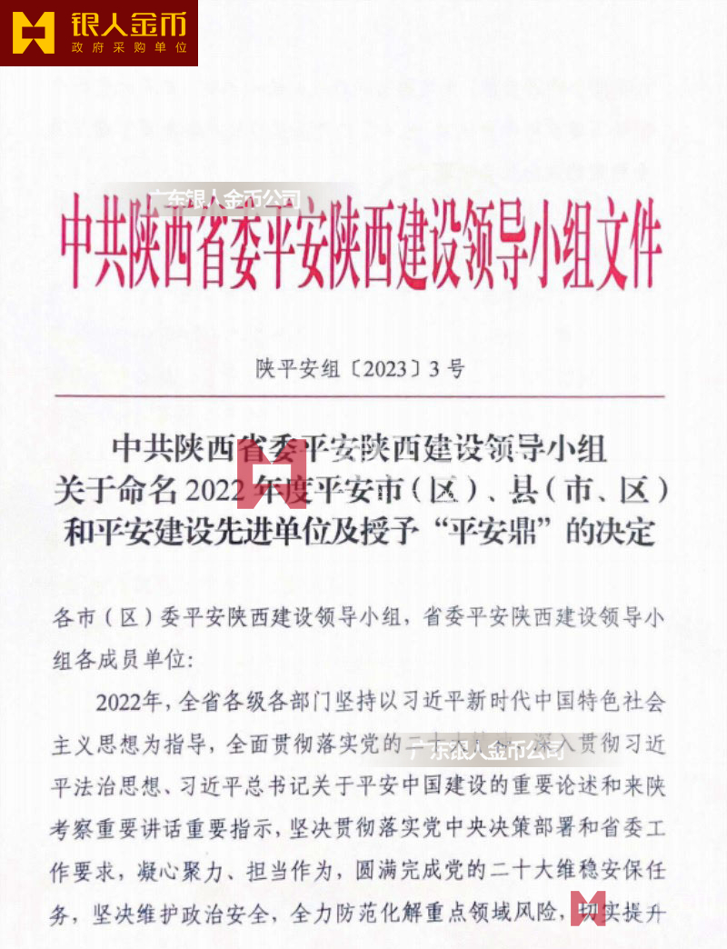 中共陜西省委政法委員會金鼎銀鼎銅鼎平安鼎和平安市區(qū)縣獎牌證書(圖)中共陜西省委平安陜西建設工作領導小組辦公室監(jiān)制頒發(fā)頒授