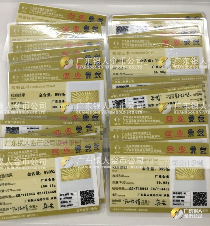 廣東銀人金幣公司承接客戶個性化定制的金銀幣、金銀章、金銀條、金銀牌、金銀盤均由國家質(zhì)監(jiān)部門、嚴格檢測、權(quán)威鑒定: